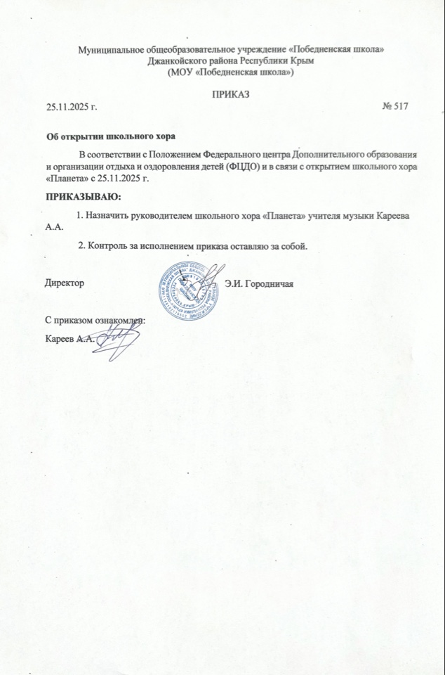В Победненской школе Джанкойского района уже не первый год успешно работает вокальный коллектив — хор «Планета». Под руководством талантливого педагога Алексея Александровича Кареева юные исполнители раскрывают свой музыкальный потенциал, покоряют сцены и дарят зрителям незабываемые эмоции. О коллективе Хор «Планета» объединяет от 12 до 16 учащихся в возрасте от 10 до 15 лет. В состав входят ребята без специальной музыкальной подготовки — главное условие для вступления в коллектив — искреннее желание петь и развиваться в вокальном искусстве. Руководитель Рулевой хора — Алексей Александрович Кареев, педагог дополнительного образования с дипломом по направлению «Педагогическое образование: музыка» (2024 г.). Несмотря на сравнительно небольшой стаж работы (1 год), Алексей Александрович сумел создать дружный и целеустремлённый коллектив, где каждый участник чувствует свою значимость и растёт как исполнитель. Творческая деятельность Хор «Планета» — активный участник культурной жизни Джанкойского района. Коллектив: выступает на школьных мероприятиях; представляет школу на районных конкурсах и фестивалях; осваивает разнообразный репертуар — от народных песен до современных композиций. На репетициях ребята не только разучивают произведения, но и: развивают музыкальный слух и голос с помощью специальных упражнений; осваивают техники правильного дыхания; работают над ансамблевым звучанием и унисоном; учатся сценическому движению и артистизму. Значение хора для школьников Участие в «Планете» даёт ребятам гораздо больше, чем просто вокальные навыки. Хор становится местом, где: формируется чувство коллективизма и взаимной поддержки; развивается эстетический вкус и любовь к музыке; приобретается ценный опыт публичных выступлений; раскрывается творческий потенциал каждого участника. Для многих ребят хор становится первой ступенькой в мир музыкального искусства, а для кого‑то — началом серьёзного увлечения вокалом. Перспективы Хор «Планета» продолжает развиваться, пополнять репертуар и готовиться к новым выступлениям. Под руководством Алексея Александровича Кареева коллектив уверенно движется вперёд, сохраняя главную цель — приобщить школьников к певческой культуре и подарить им радость совместного музыкального творчества. Если вы хотите узнать больше о хоре «Планета» или записать ребёнка в коллектив, обращайтесь в Победненскую школу по адресу: с. Победное, ул. Ленина, д. 58.